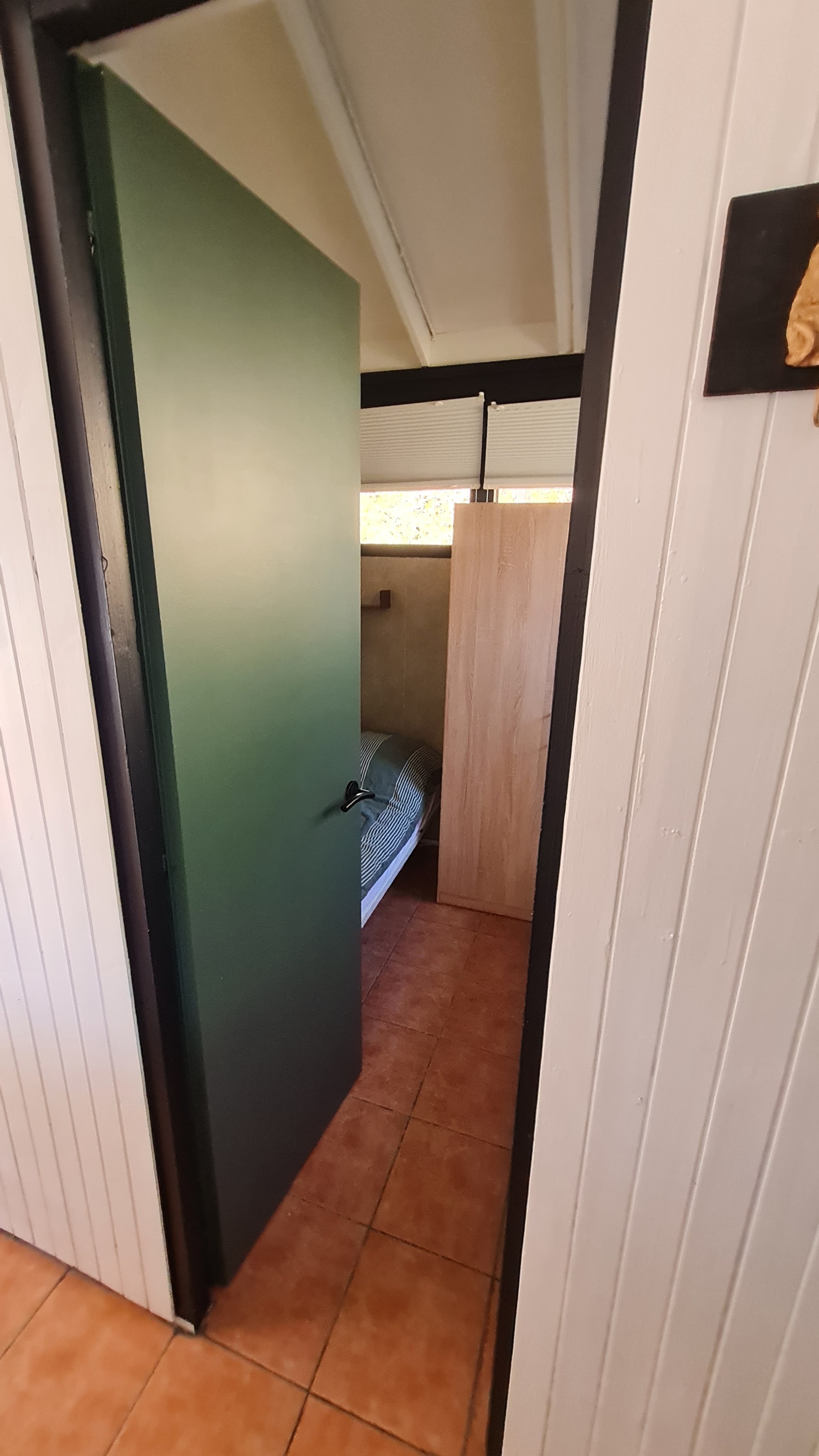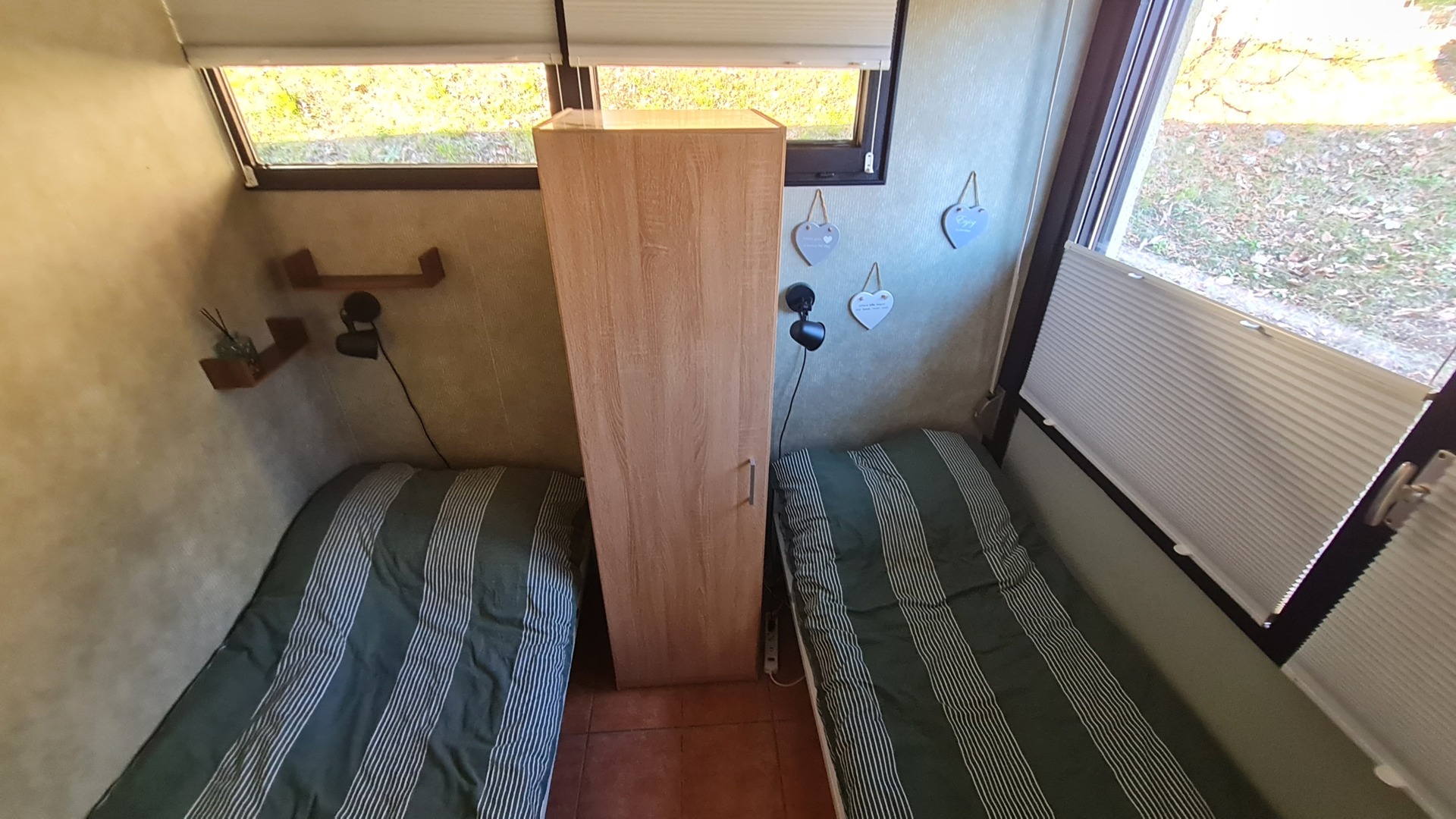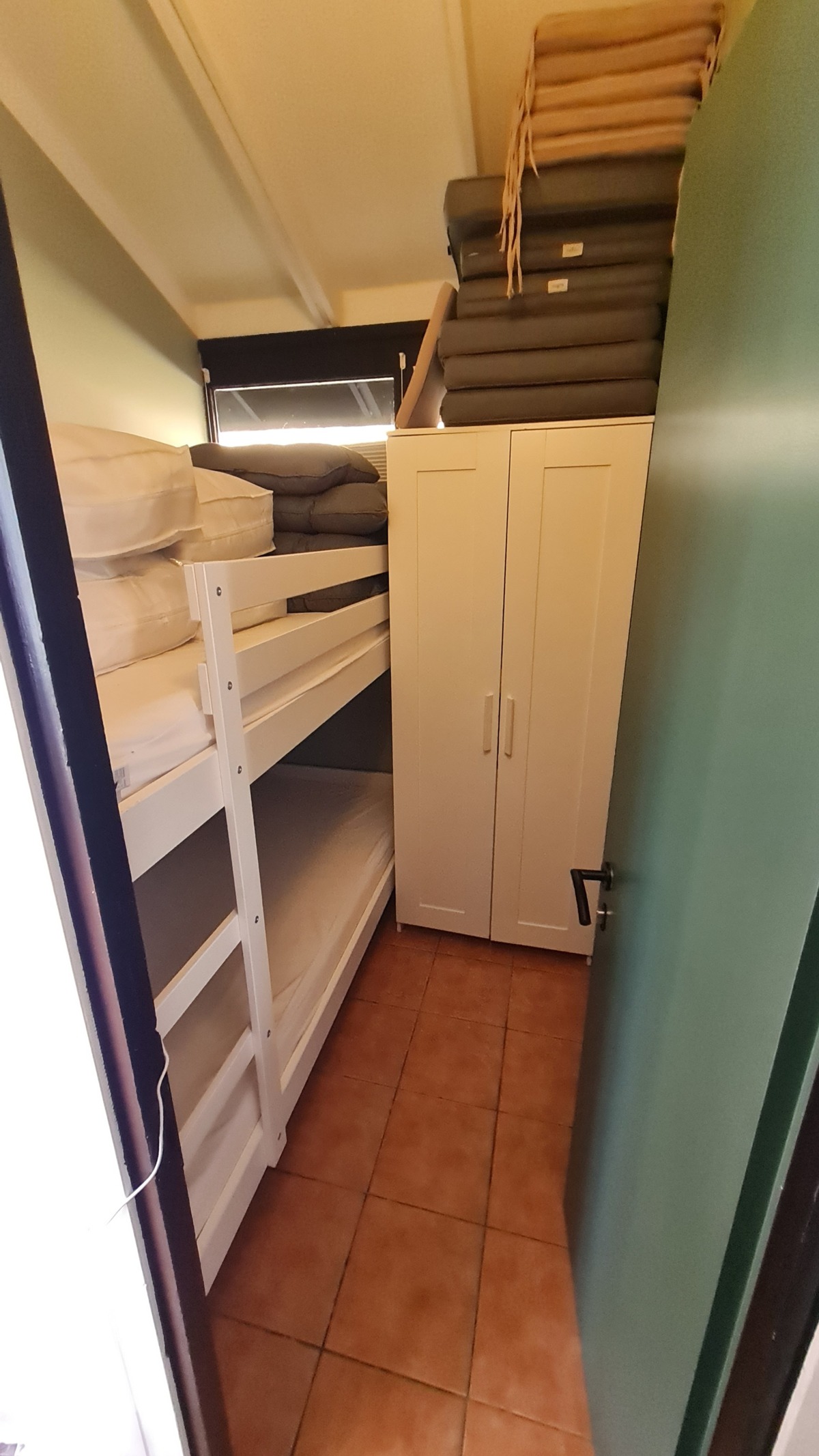 Es gibt 3 Schlafzimmer, eines mit einem Doppelbett, eines mit einem Etagenbett und eines mit zwei Einzelbetten. Alle Zimmer verfügen über Stauraum.