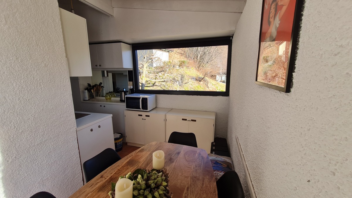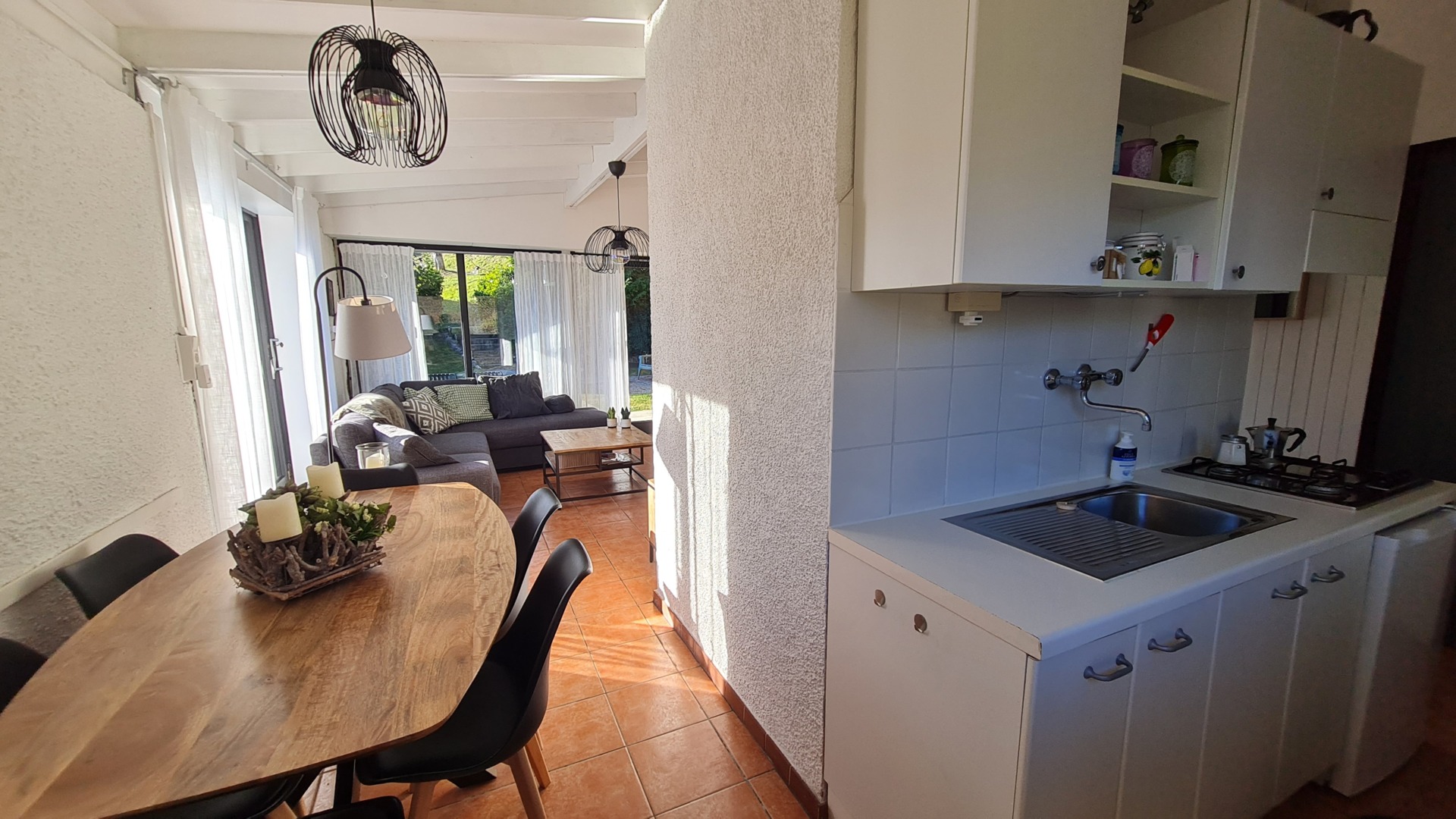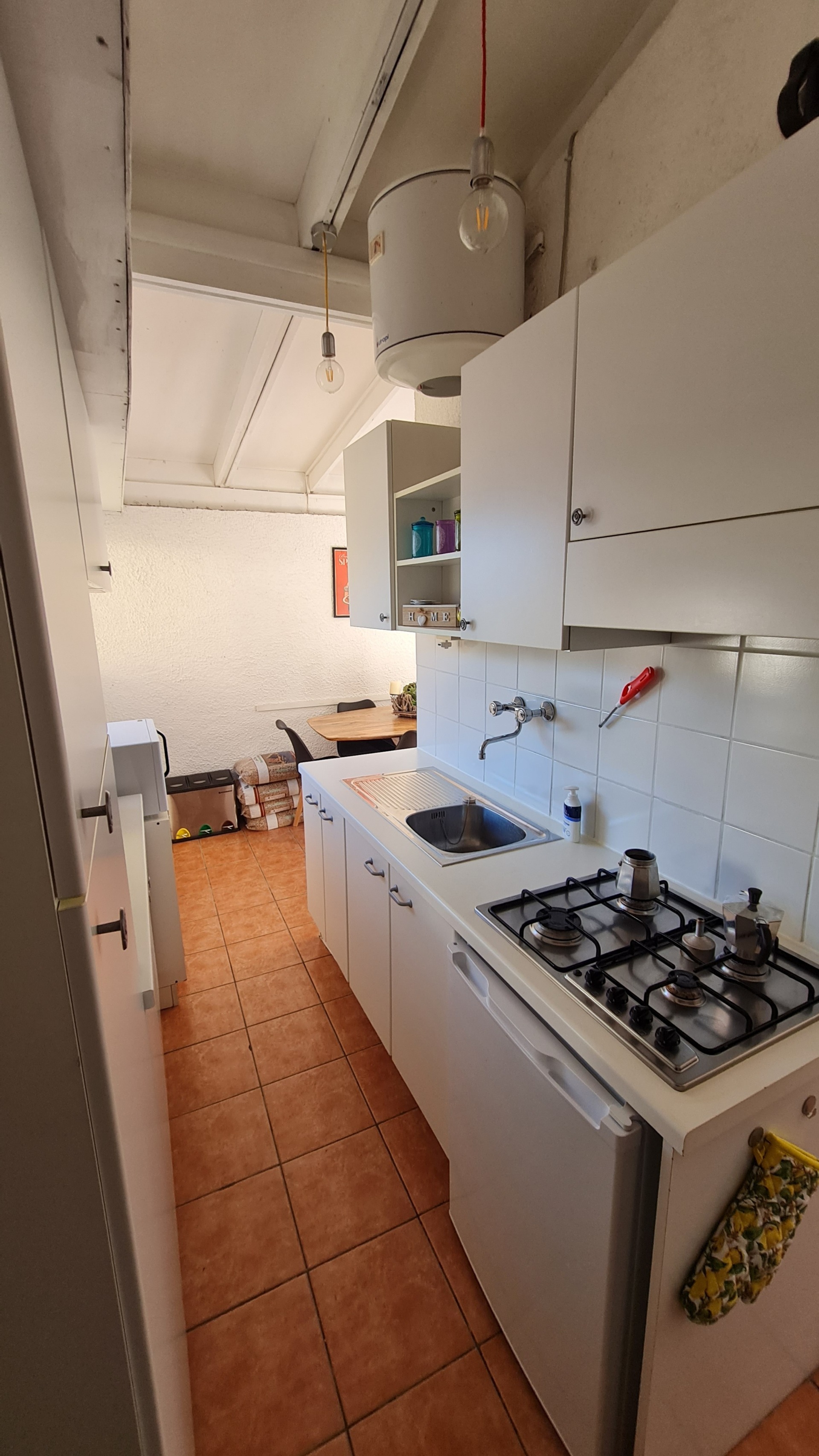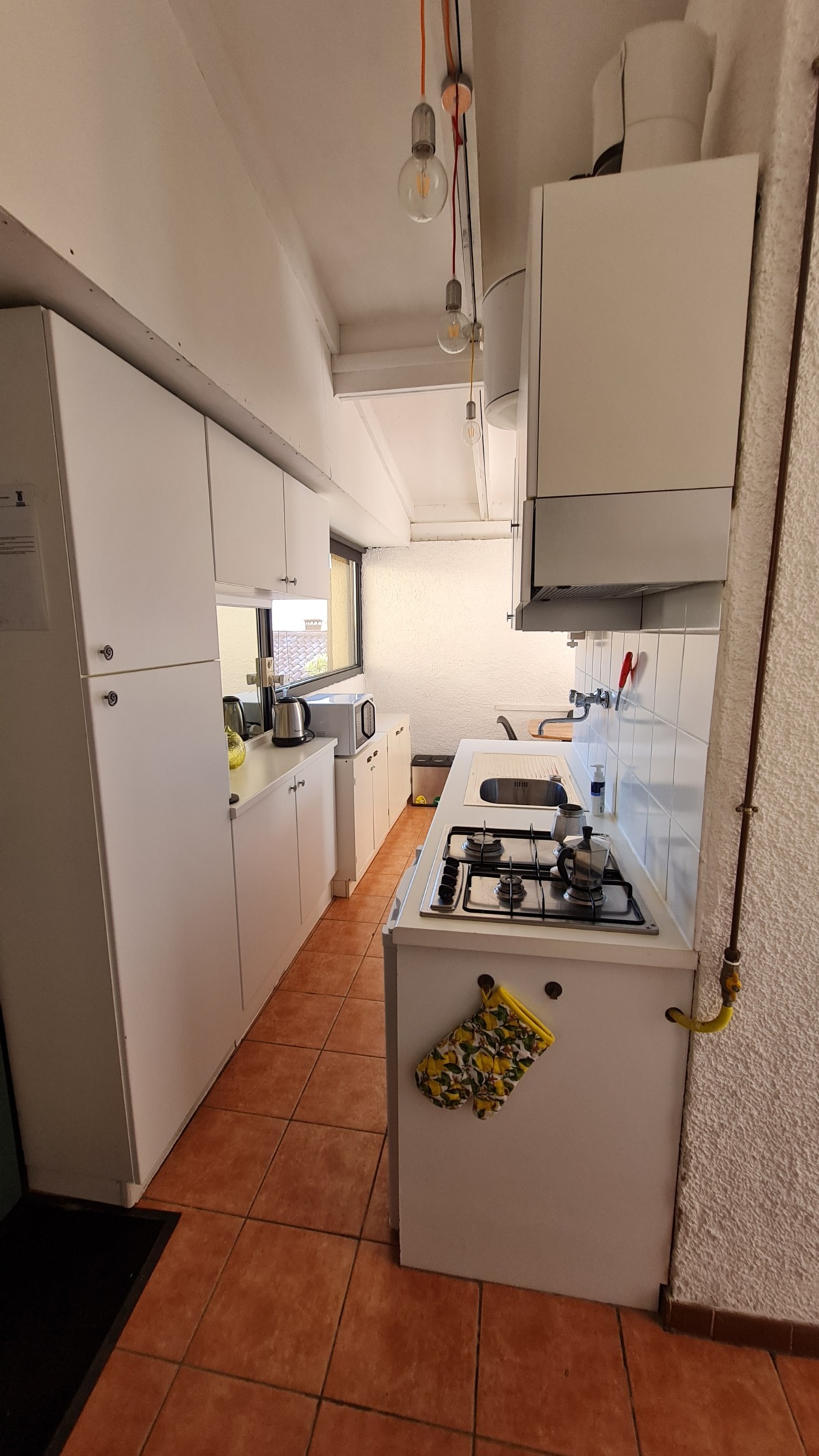 Die helle Küche ist mit einem 4-Flammen-Gasherd, einer Dunstabzugshaube, einem kleinen Kühlschrank mit Gefrierfach und einer Mikrowelle ausgestattet.